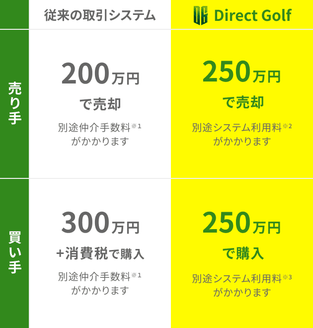 ※4 【従来の取引システム】 2,000,000円−手数料55,000円=1,945,000円 【Direct Golf】2,500,000円−(システム利用料125,000円+システム利用料の消費税12,500円)=2,362,500円 【差額】417,500円